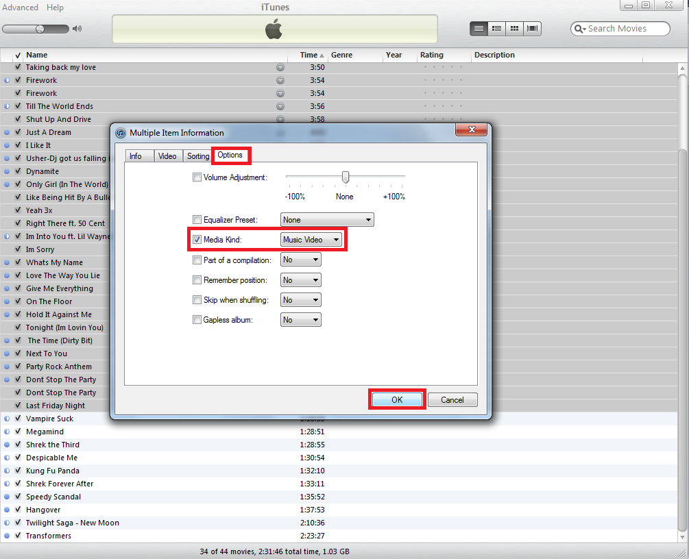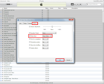 Зурган дээр дарж томруулна уу! Алхам 4 Ингээд гарч ирэх цонхноос "Options" tab руу ороод "Media Kind" гэсэн хэсгээс "Music Video" гэдгийг сонгож өгсөнөөр дээр сонгогдсон клип кинонууд тус тусдаа цэгцлэгдэнэ.